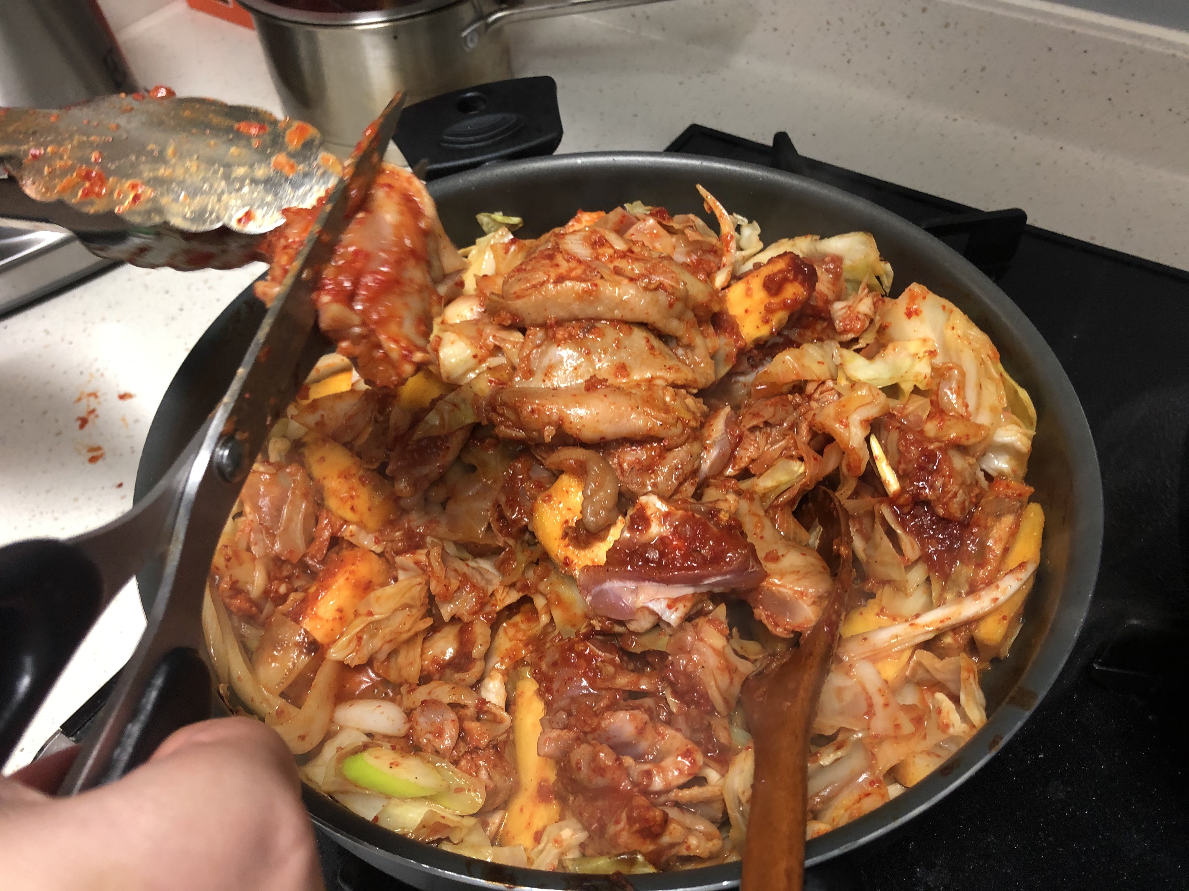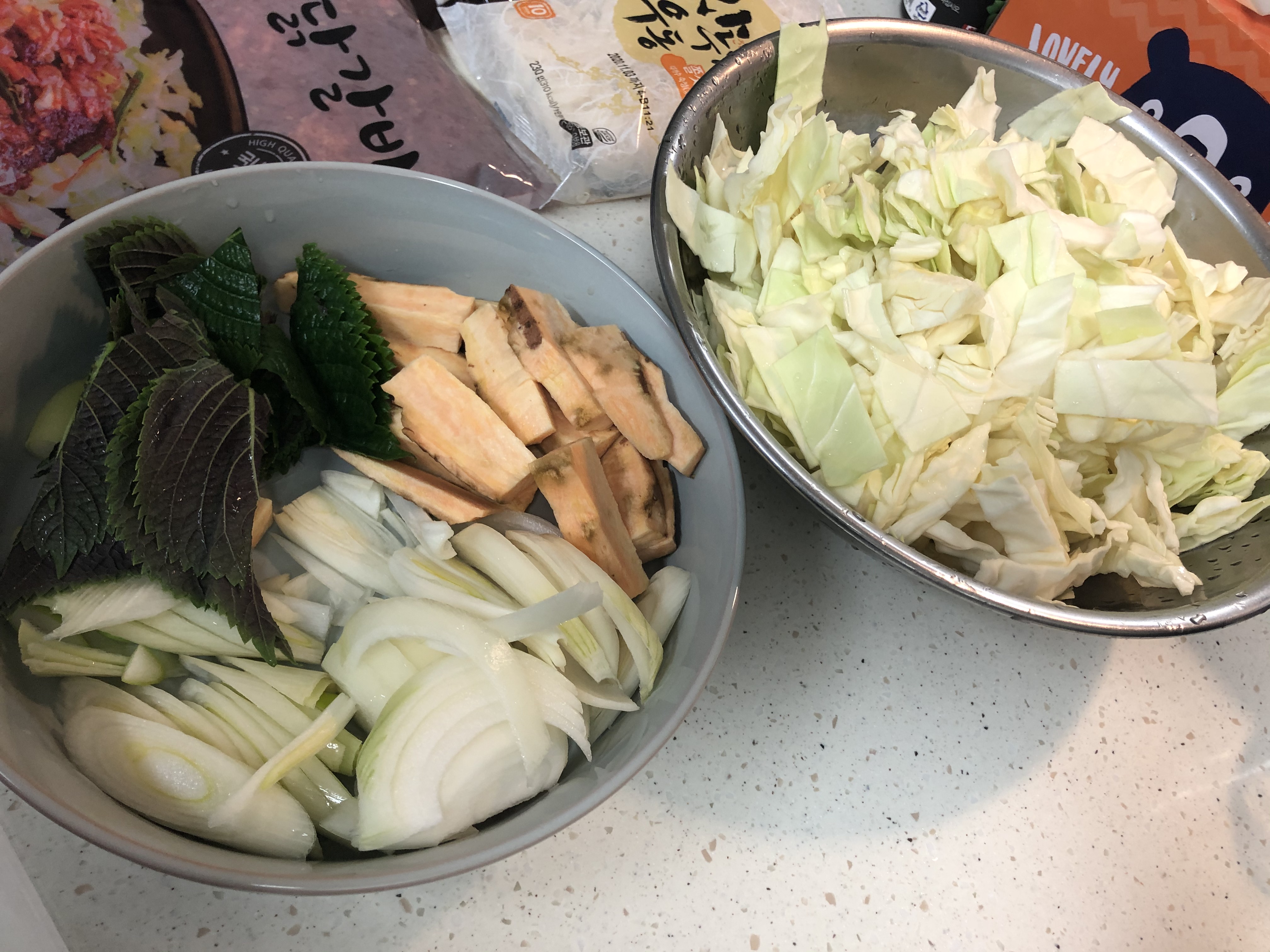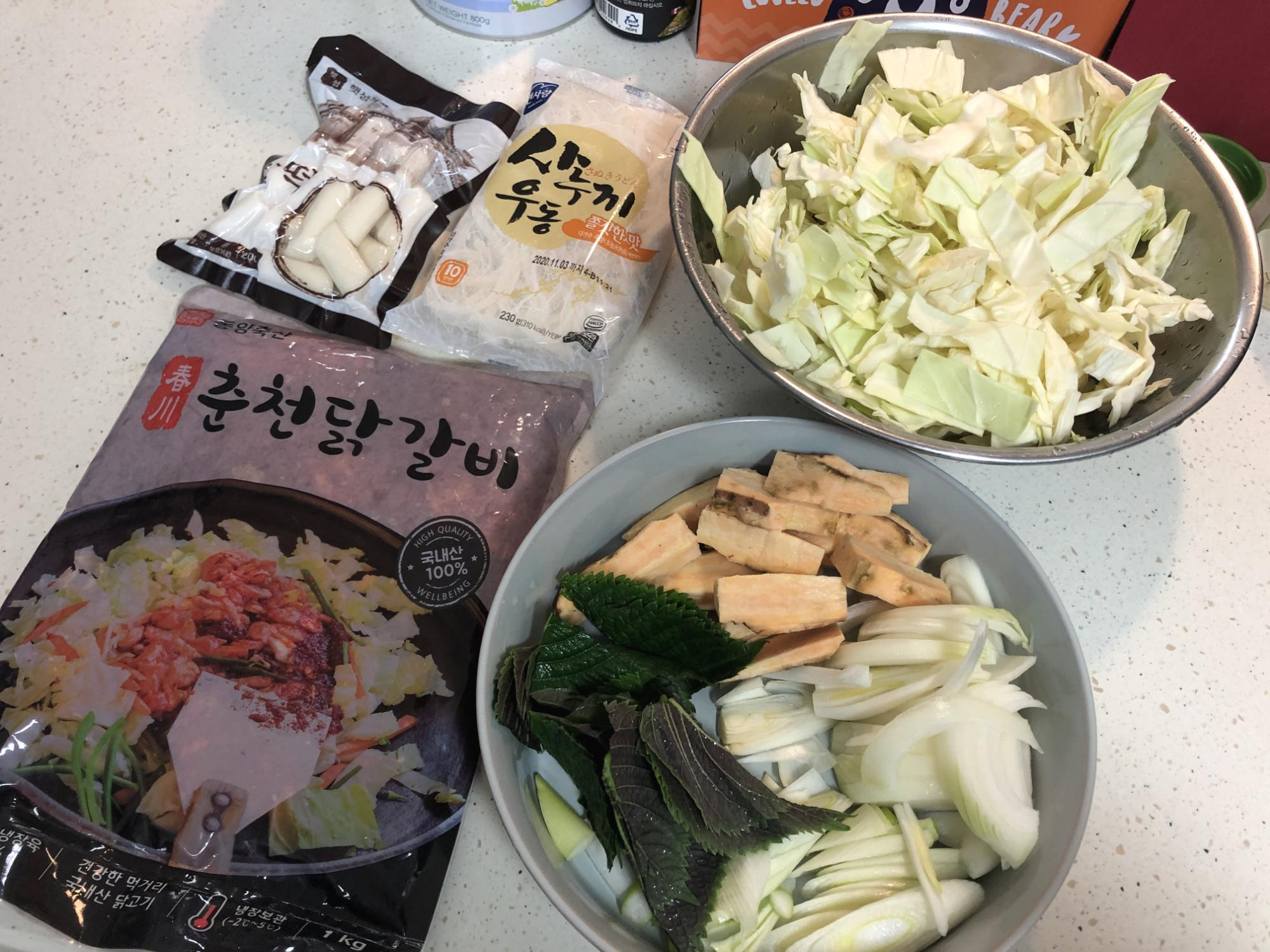재료 : 닭갈비 1팩(1kg), 양배추 1/4통 (큰 사이즈), 고구마 1개(200g), 대파 1 뿌리,