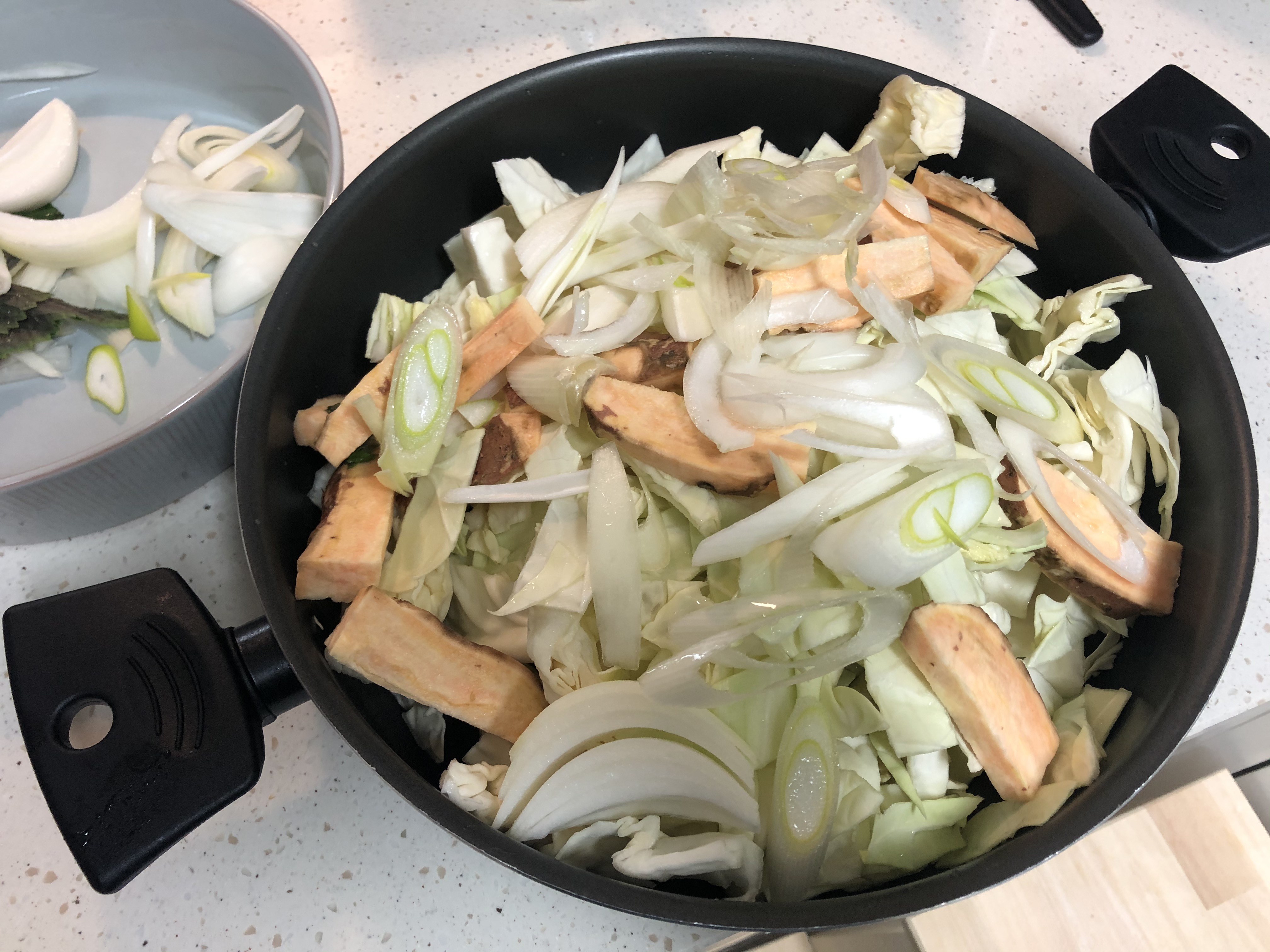 2. 양배추는 두껍게 썰고 고구마는 손가락 크기로 썹니다.