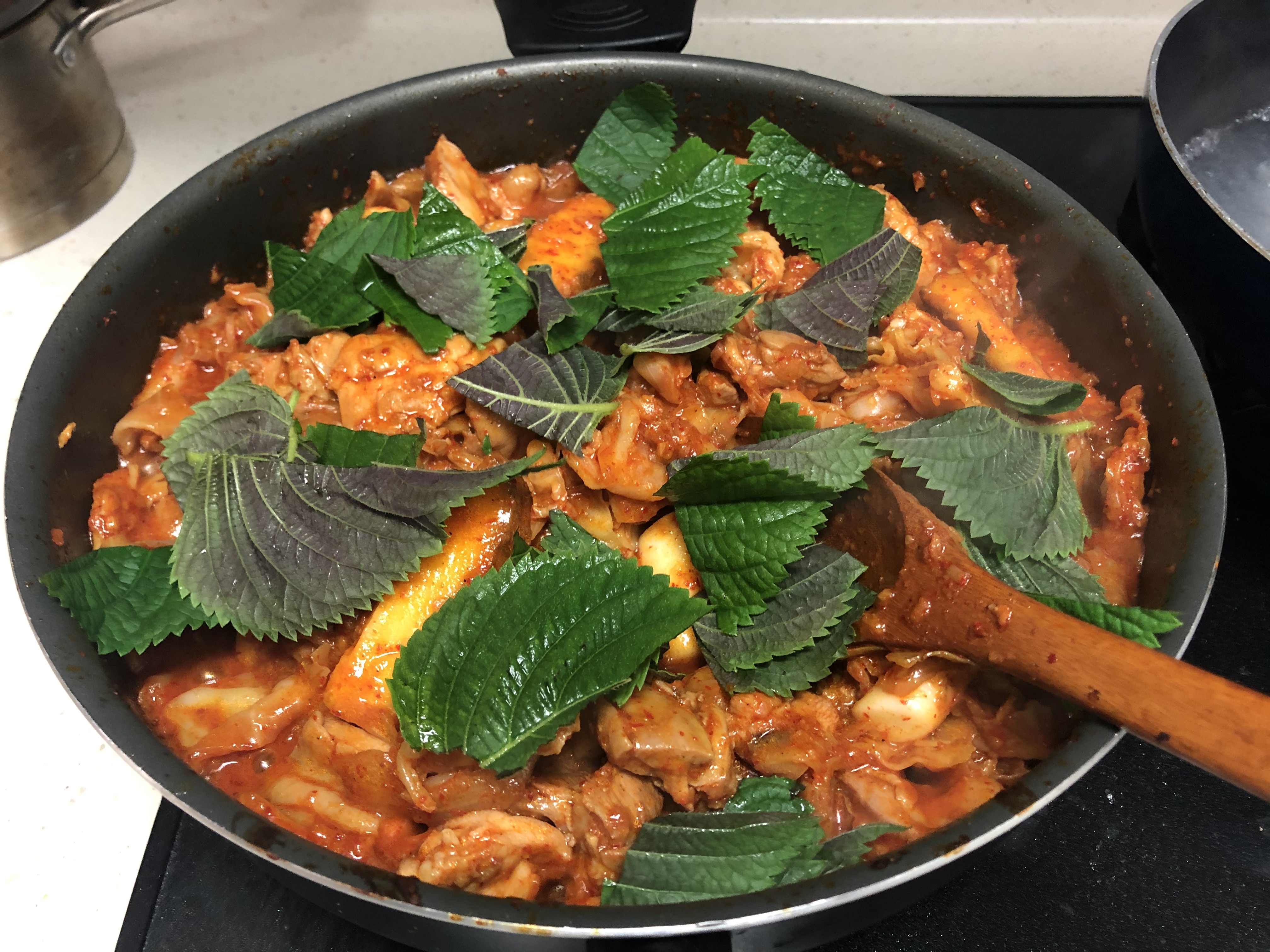 7. 완성되었을 때쯤 깻잎을 넣고 한번 더 볶습니다.