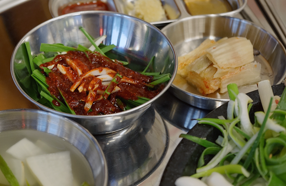 기본 세팅은 소스, 부추무침, 묵은지, 파김치, 콩나물국, 동치미가 나옵니다.