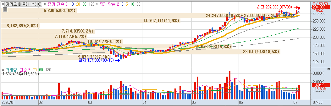 카카오의 주가는 신고가를 계속 경신하고 있는 중인데요