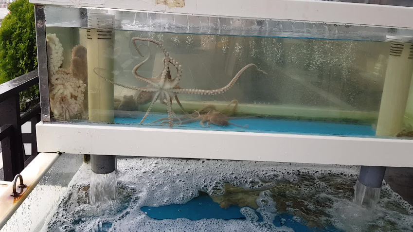 입구에는 꿈들 꿈틀 산 낙지가 손님들을 반기고 있습니다.