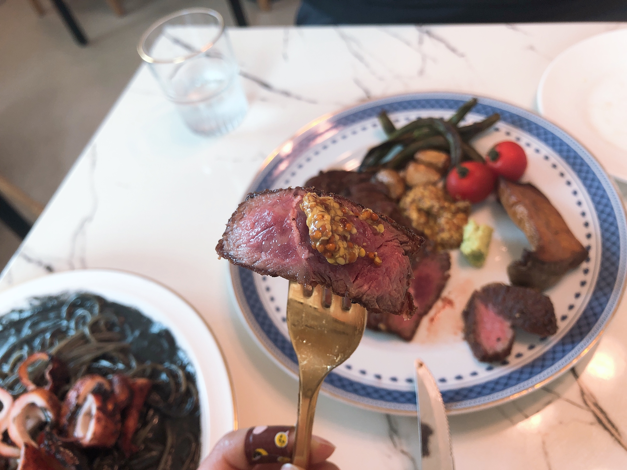 이곳의 시그니처는 오징어 먹물 파스타 , 부채살 스테이크라고 하여