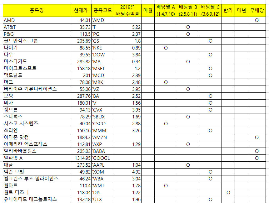 기타로 매월, 반기, 매년, 무배당 칼럼도 만들어 줬습니다.