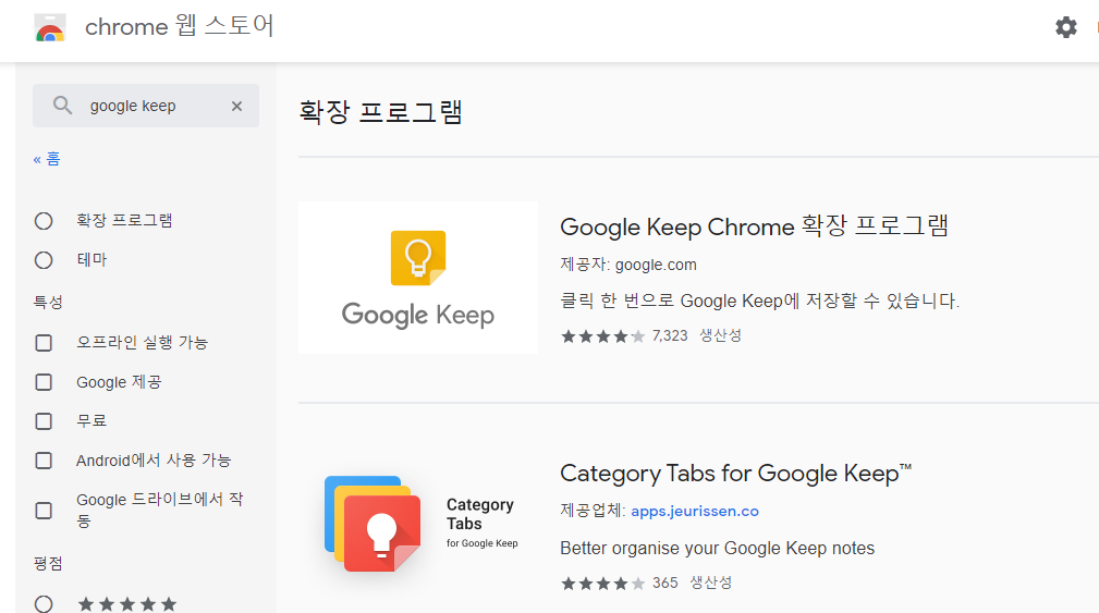 크롬 웹 스토어에 접속하여 google keep을 검색하면 확장 프로그램이 나옵니다.