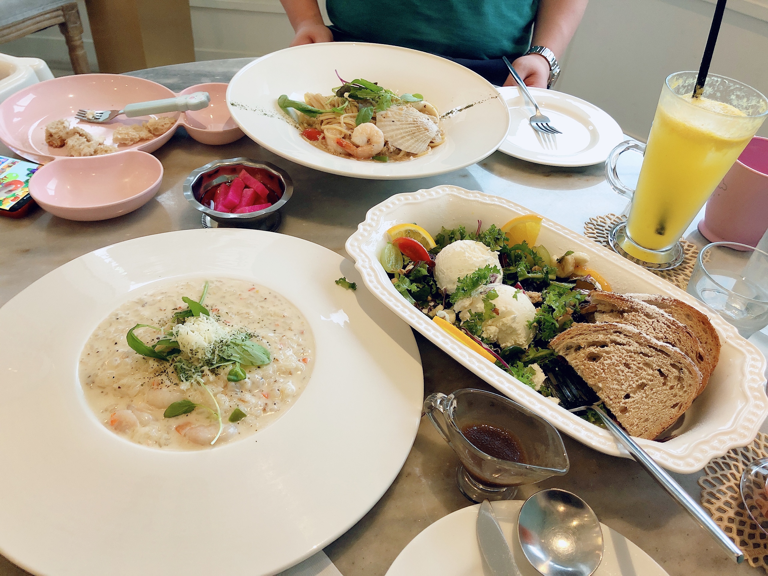 가장 인기가 좋다는 리코타 치즈 샐러드, 명란 오일 파스타와 새우 크림 리소토도 함께 주문해 보았습니다.