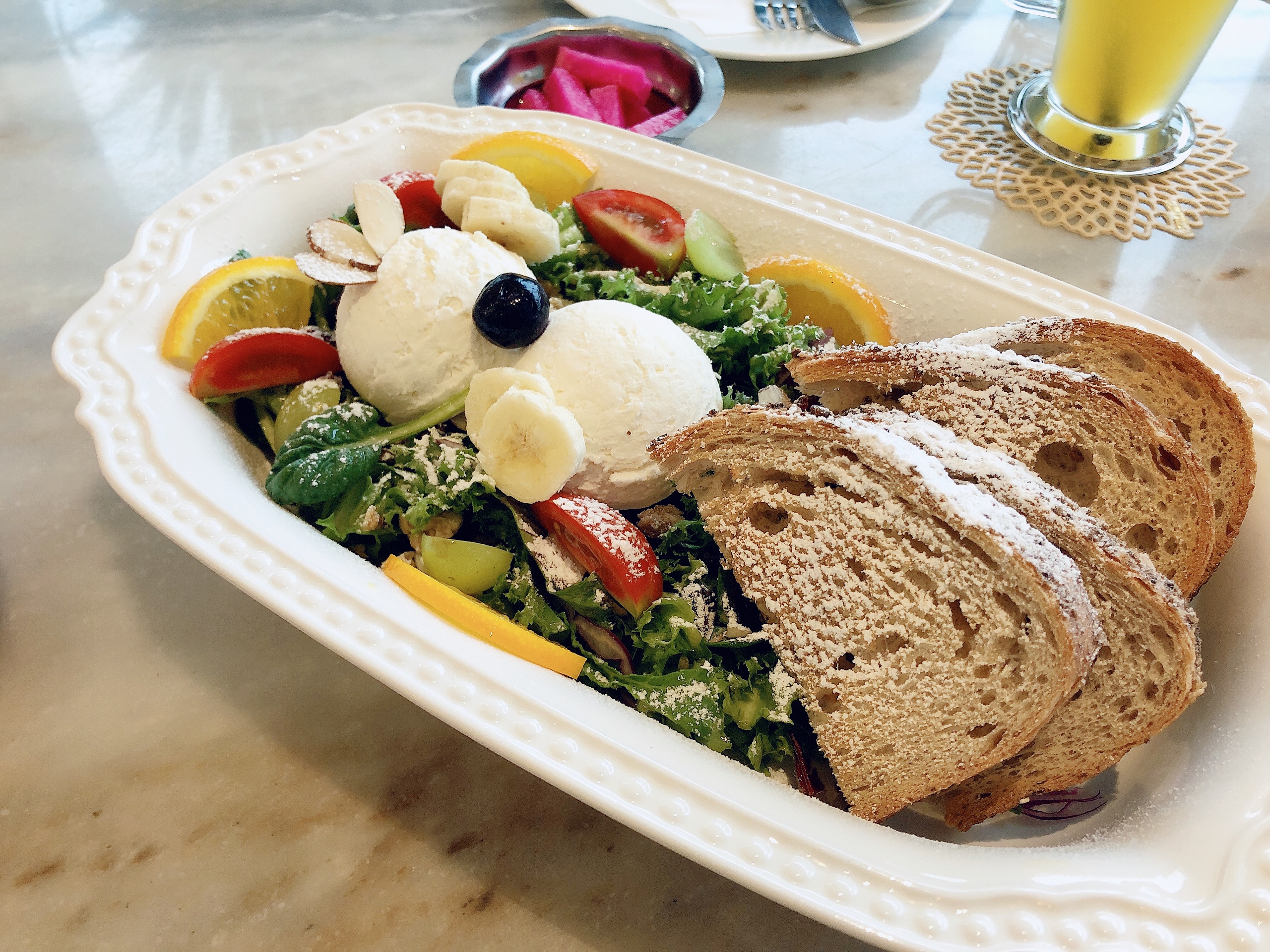 * 리코타 샐러드에는 치즈 이외에 갓 구운 빵과 과일, 그래놀라가 들어가 있고 드레싱은 발사믹으로 제공됩니다.