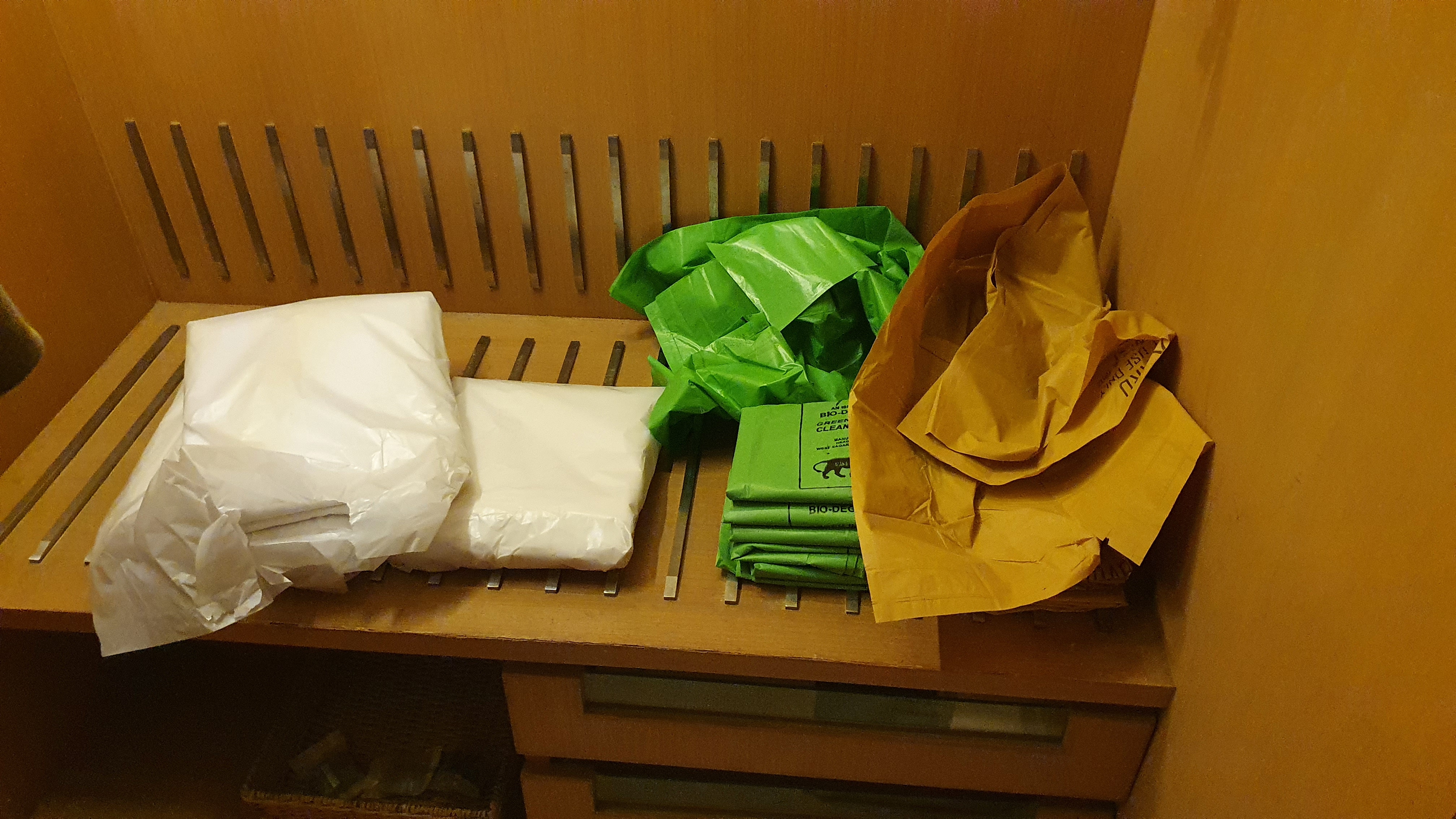 도시락을 먹고 나면 쓰레기봉투에 넣어놨다가 밤에 방밖에 내놓습니다.