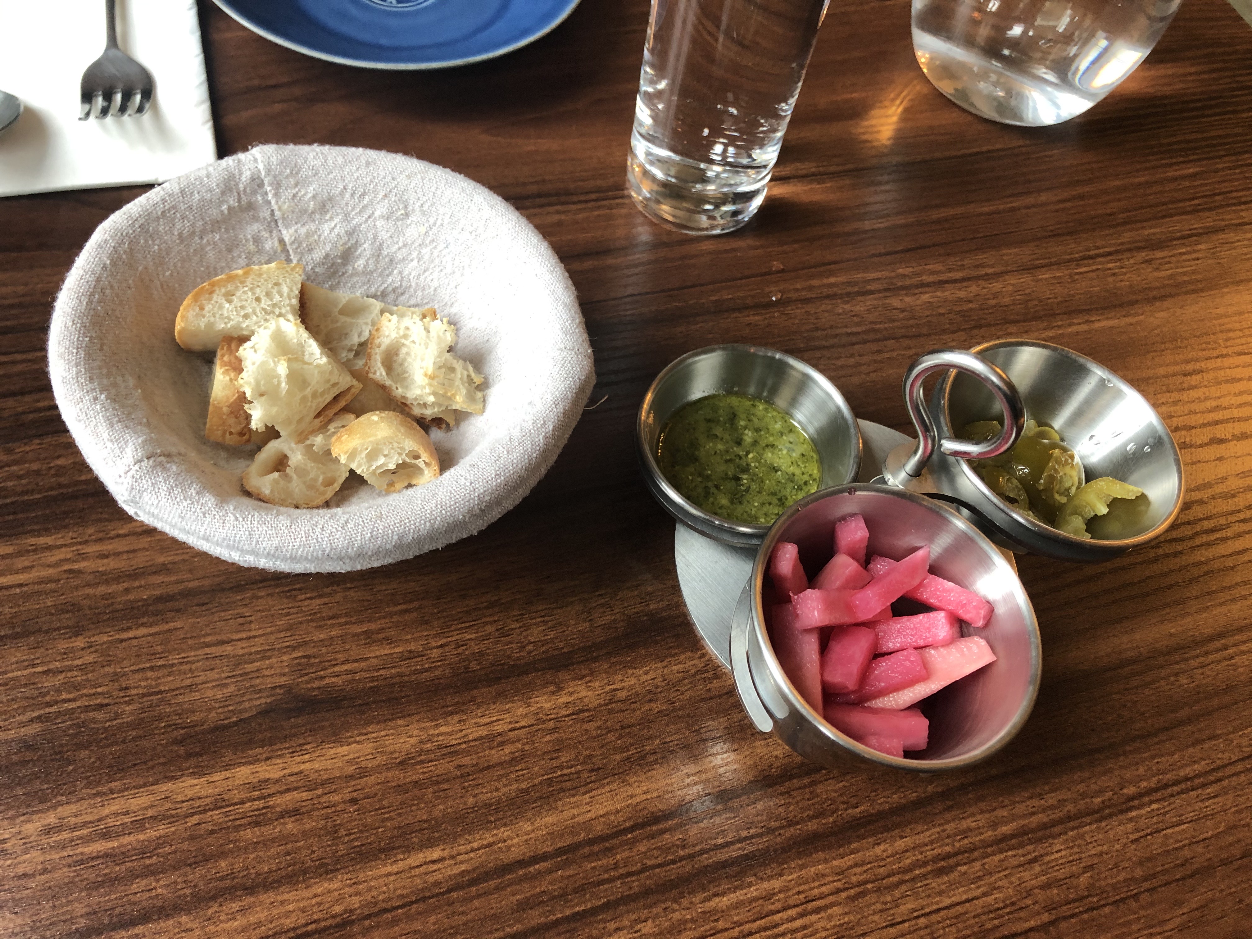 식전 빵은 바게트였고 소스는 바질 페스토, 무 피클, 할라피뇨가 제공됩니다.