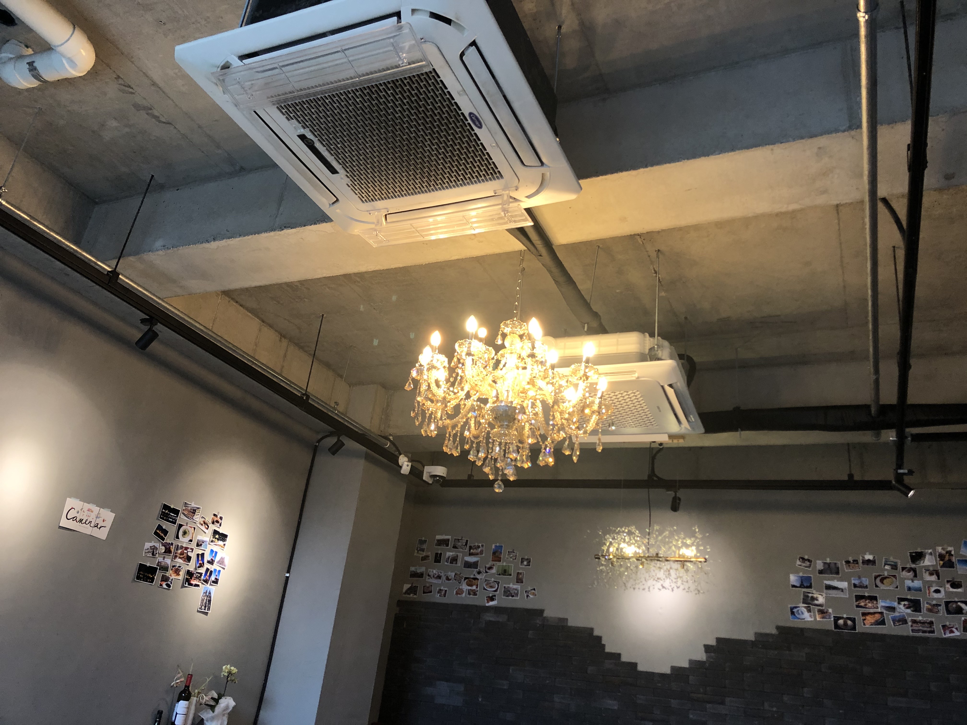 천장에는 큰 샹들리에가 눈에 띄고 포인트 되는 조명이 여러 개 있습니다.