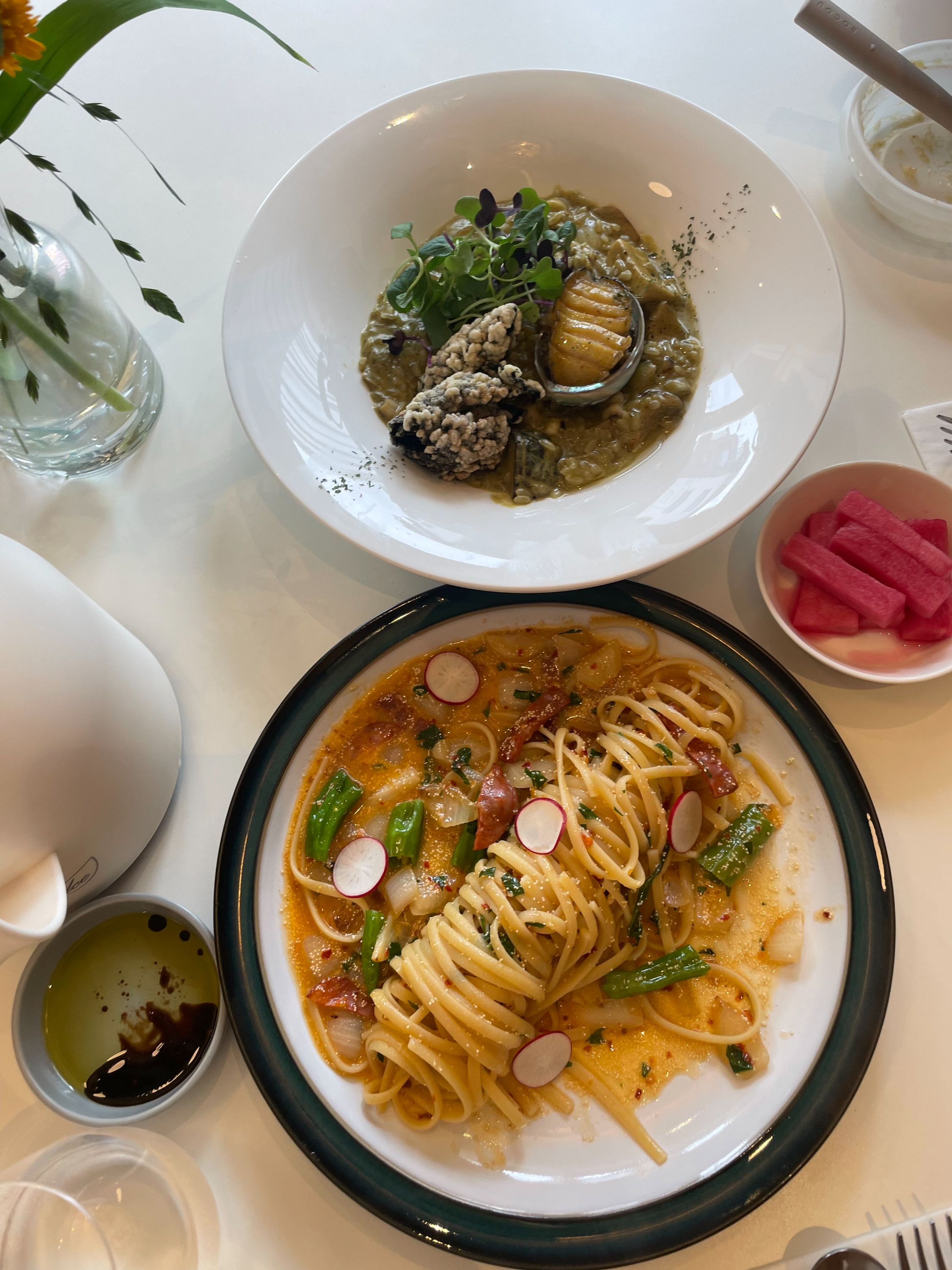 명란 초리조와 전복 트러플 크레마 리소토를 주문했습니다.