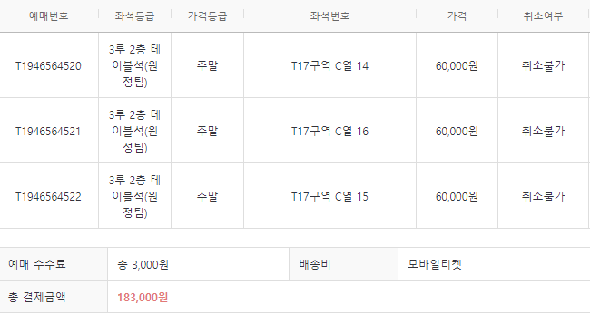 좌석당 6만 원 total 183,000원 들었습니다.