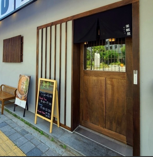 스테이크 솥밥, 도미 관자 솥밥 입간판이 보여요.
