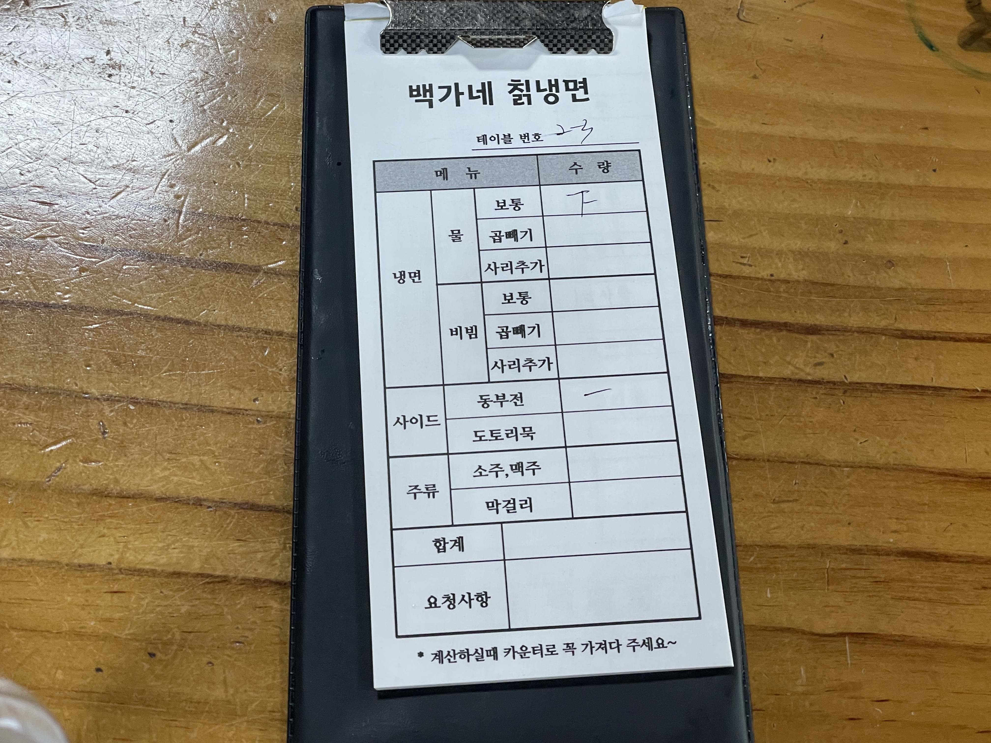우선 물냉면 3개와 동부전 1개를 주문했어요.