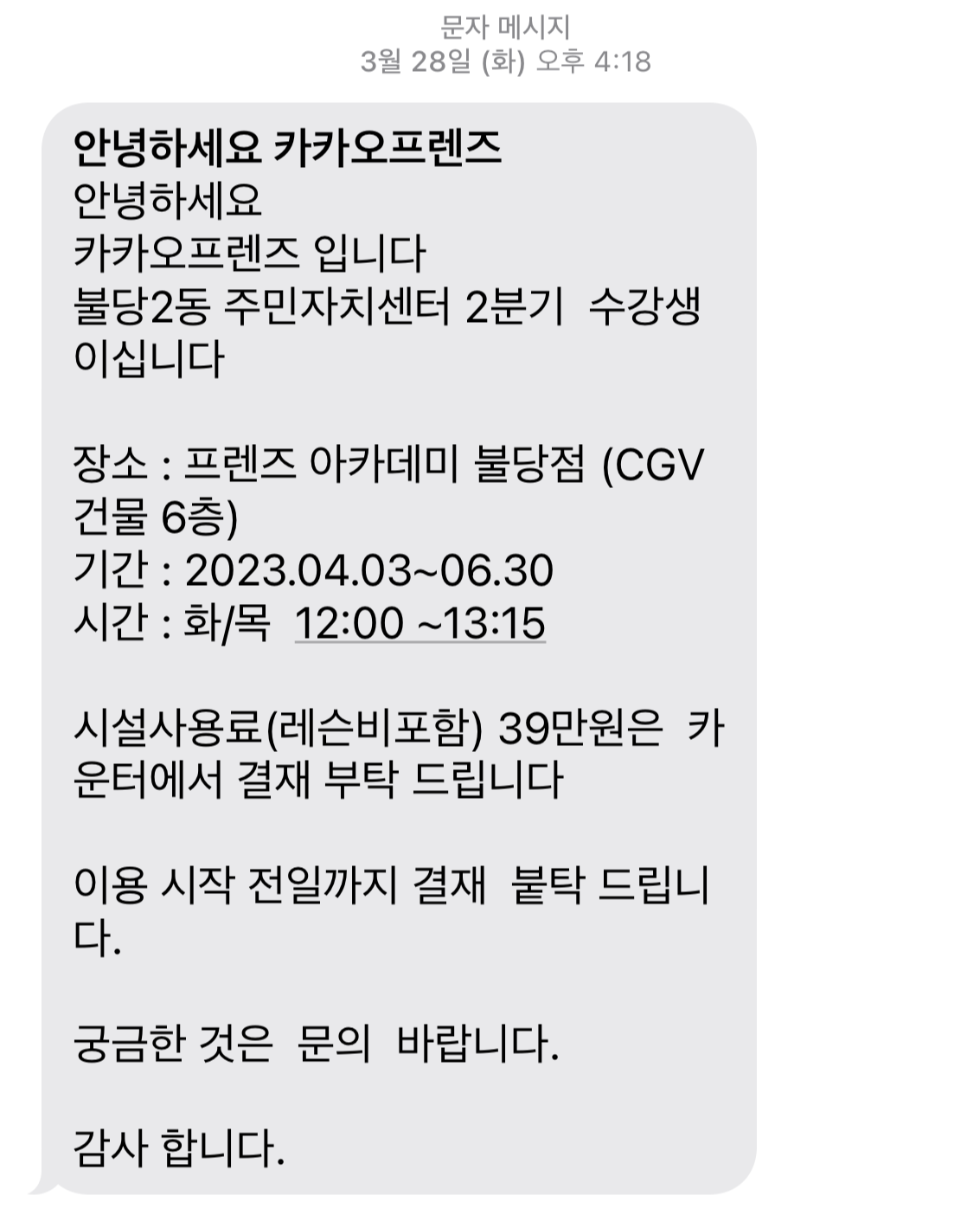 이용료는 아카데미 현장에서 39만 원 결제했습니다.