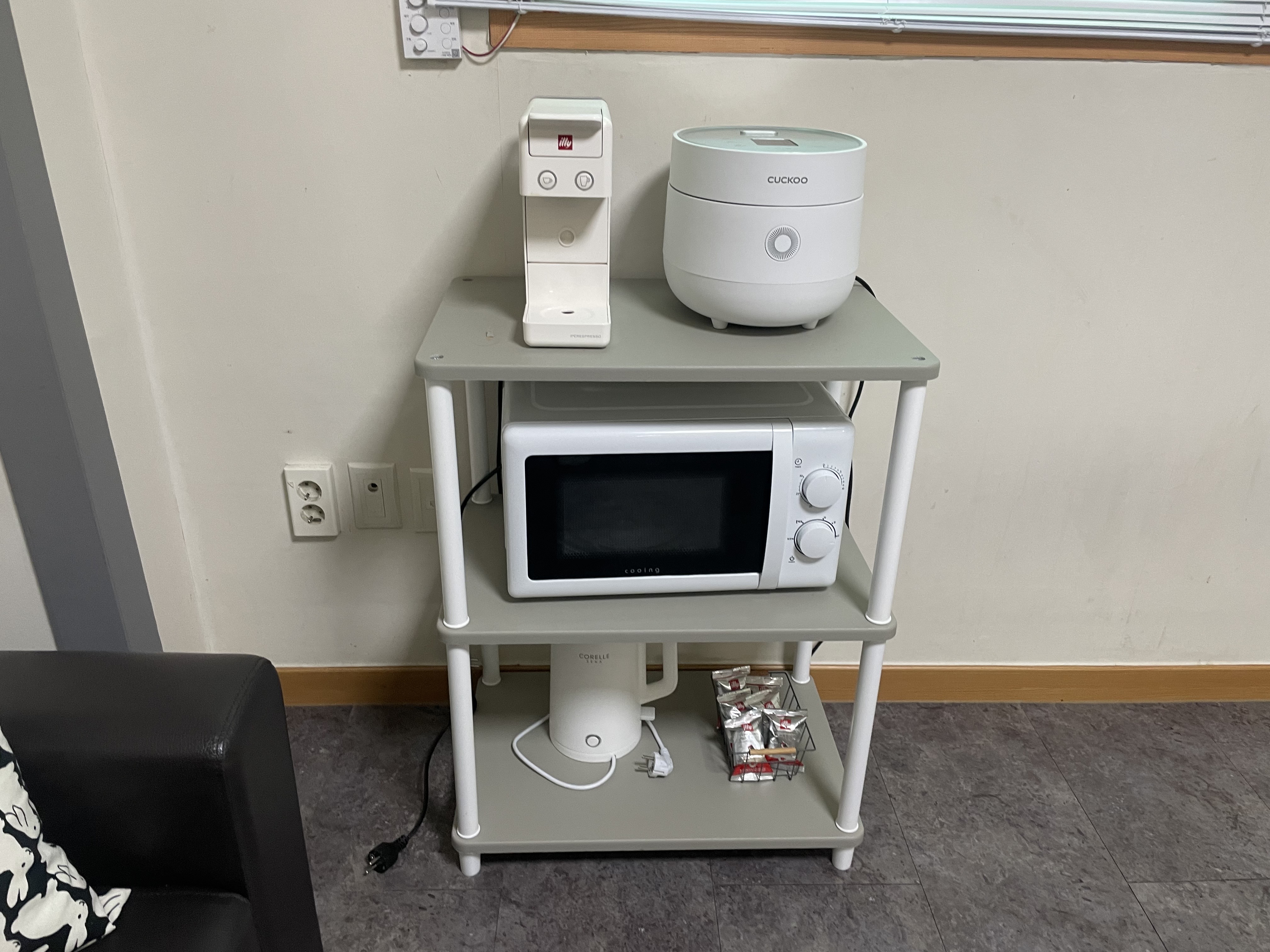소파옆에는 전자레인지, 밥솥, 커피머신, 포트가