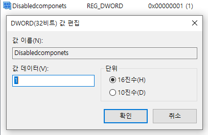 'Disabledcomponets'을 입력하고 값에 '1'을 입력하고 확인을 눌러줍니다.
