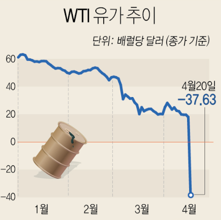 코로나 19의 여파로 원유 수요가 급감하면서 국제 유가가 마이너스를 기록하였습니다.